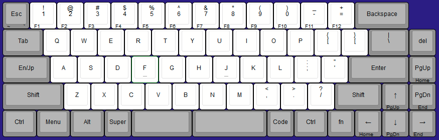 キー配列は65%のRow Staggered。基本的にはunity69と一緒なのだが、分割したスペースキーの境界の位置に不満があった。自分は主に右親指でスペースキーを打鍵するのだが、unity69の配列だと時々の境目近くを打鍵して左隣のキーの端を親指がかすめる。誤って左スペースを押してしまうことは無いものの、隣のキーをかすめる感覚は気持ちよくはない。そこで境界を0.25u左にずらし、その文右Ctrlを1.25uから1.5uに変更した。